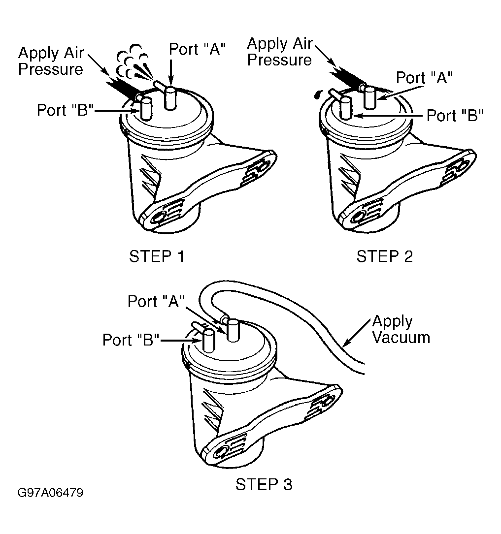 - Disconnect vacuum hoses from vacuum tank. Vacuum tank is located at left side of engine compartment, under battery tray. Apply air pressure to port "B" on vacuum tank. Ensure air flows from port "A". Perform STEP 1. See Fig 1. Apply air pressure to port "A". Ensure air does not flow from port "B". Perform STEP 2. See Fig 1. Go to next step.