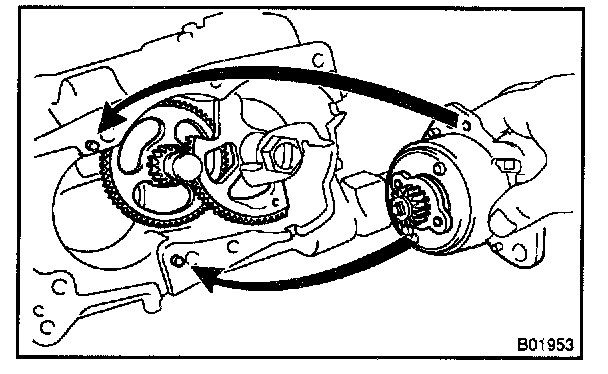 3. Rotate the motor to the direction marked with an arrow and temporarily install the set screw "A" under the condition that there is no wobbles in the motor and the positioning pin.