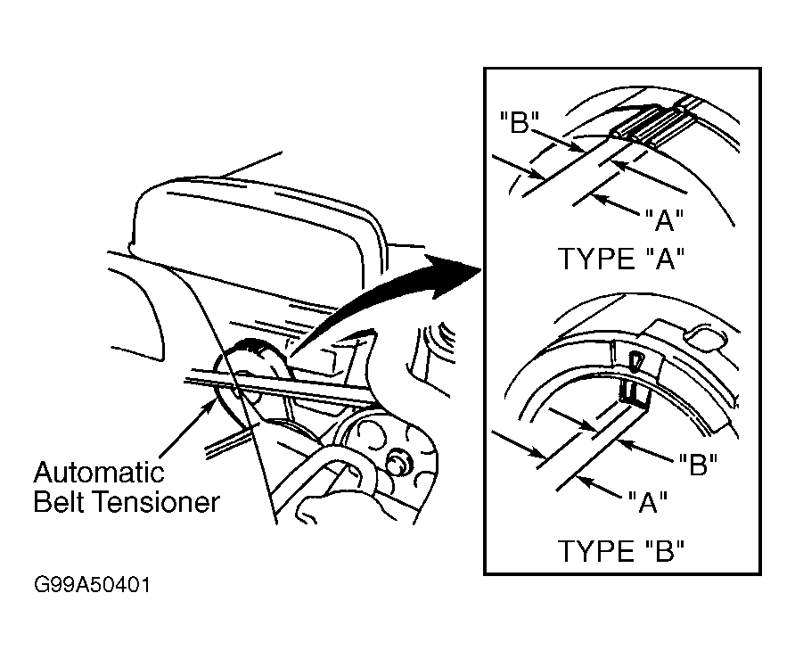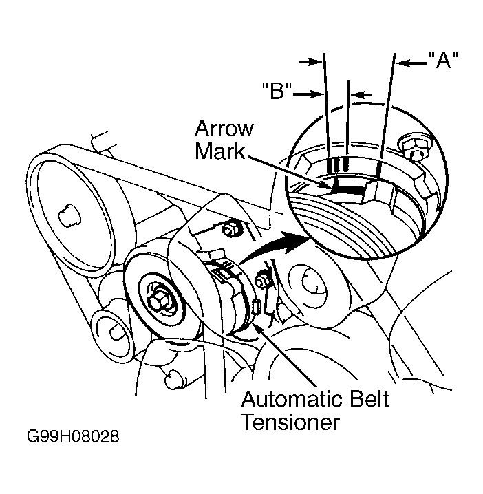 (2) Automatic belt tensioner is used. Adjustment is not required. Belt must be replaced if arrow mark on automatic belt tensioner is not within area "A". See Fig 1-Fig 3 .