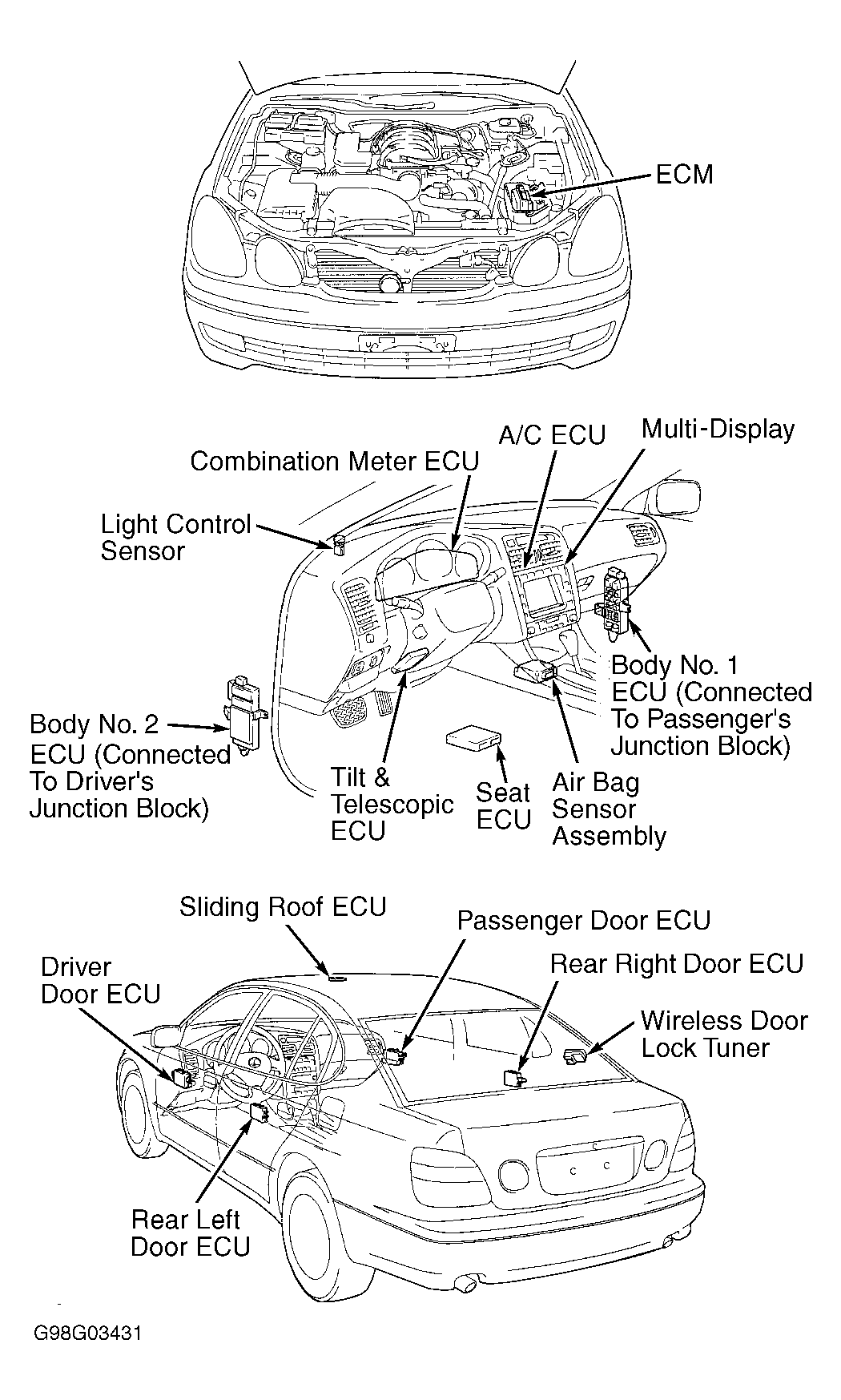 The multiplex control system is controlled and monitored by the body No. 1 and the body No. 2 Electronic Control Units (ECUs). See Fig 1. Other components in the system include the following: