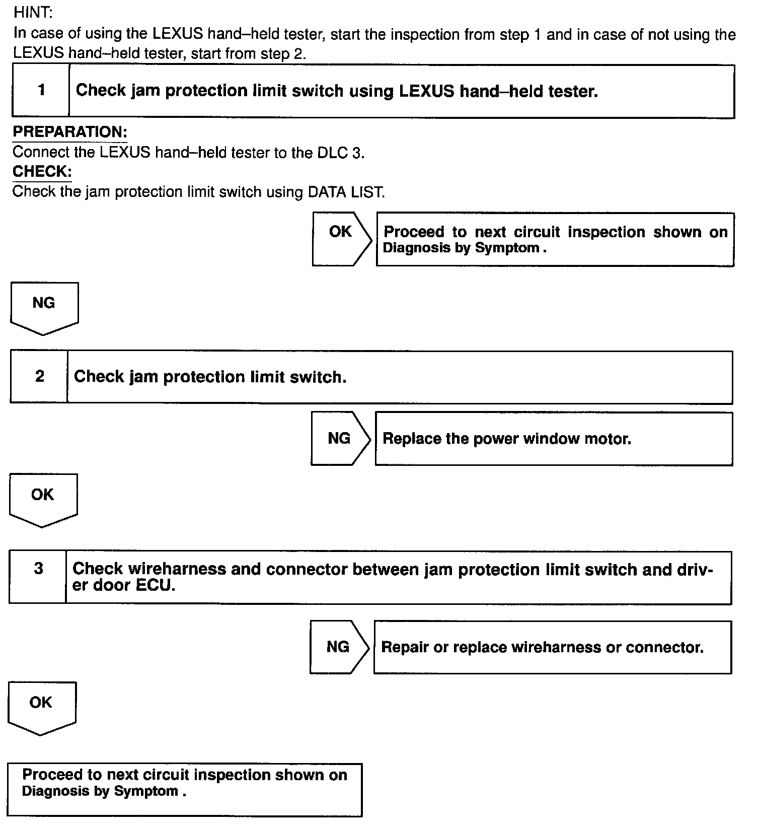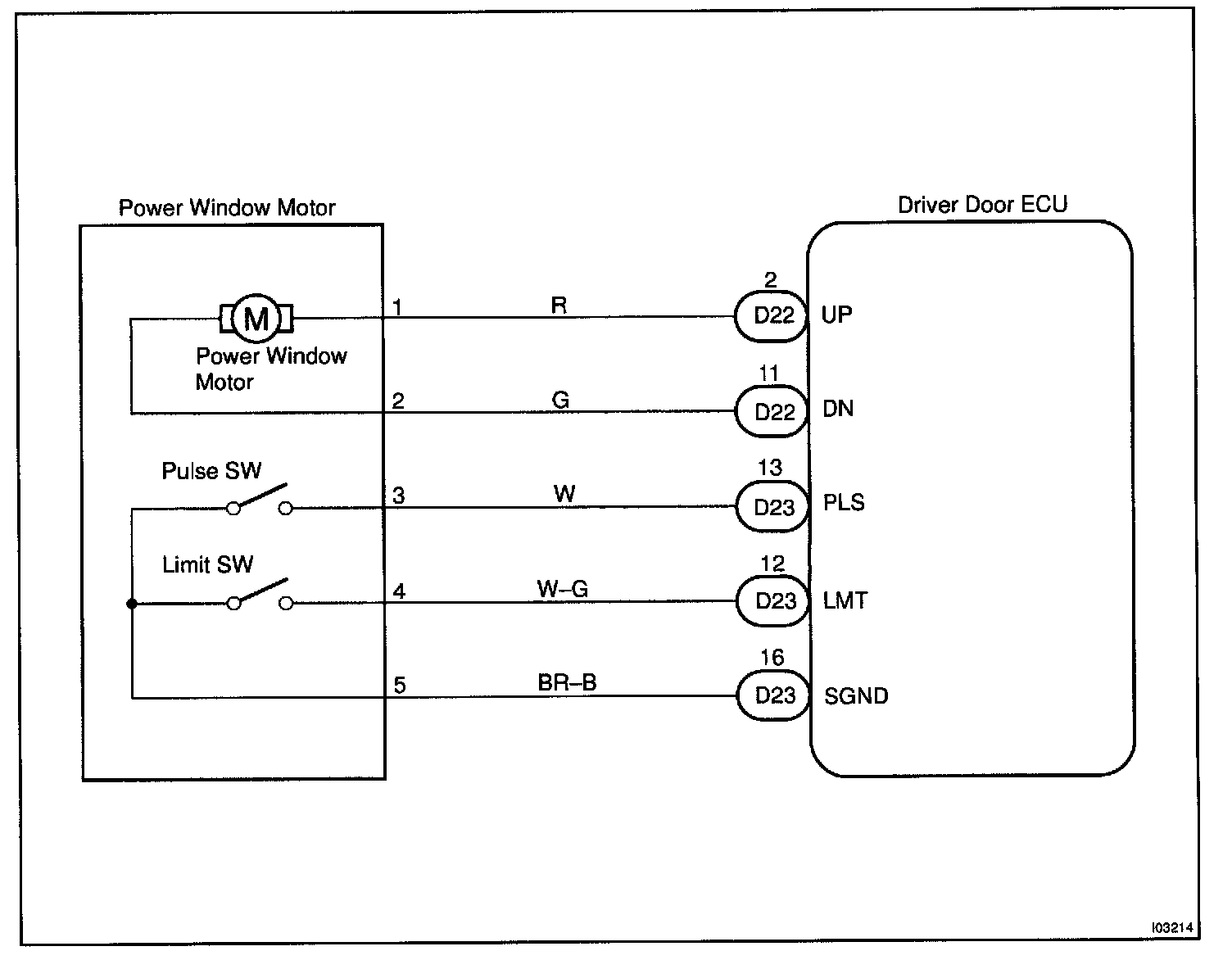 CIRCUIT DESCRIPTIONJam protection limit switch is built-in the power window motor. This switch functions to turn "OFF" before the top dead center, and ECU reads this "OFF" signal resulting in closing the window fully.