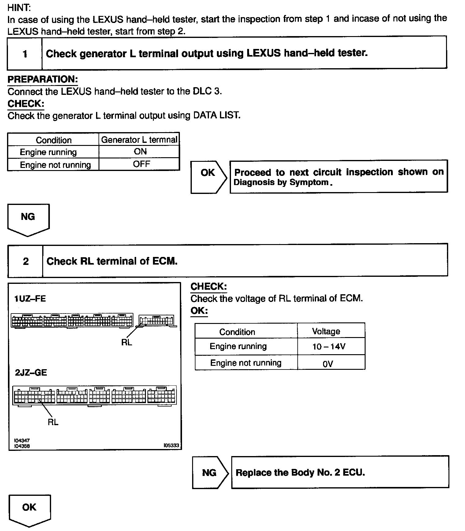 Home >> Lexus >> 2000 >> GS 400 V8-4.0L (1UZ-FE) >> Repair and Diagnosis >> Powertrain Management >> Computers and Control Systems >> Body Control Module >> Testing and Inspection >> Component Tests and General Diagnostics >> Generator L Terminal Circuit (W/ DRL Vehicle Only)