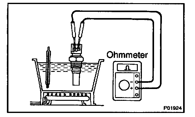 a. Using an ohmmeter, check that no continuity exists between the terminals when the coolant temperature is above 100 °C (212 °F).