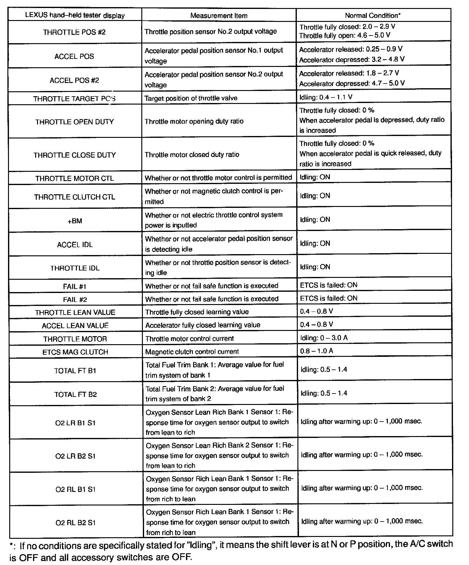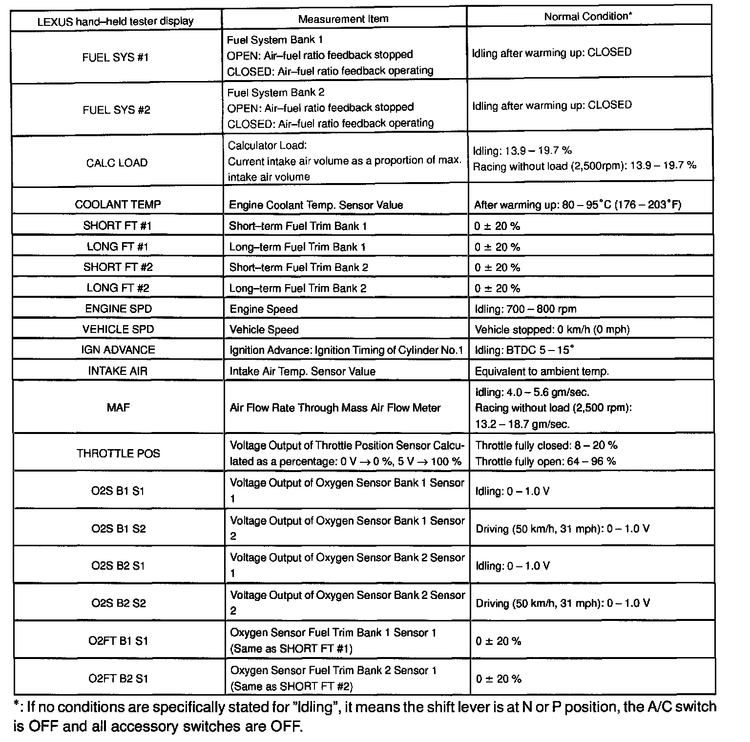 ENGINE OPERATING CONDITIONNOTE: The values given for "Normal Condition" are representative values, so a vehicle may still be normal even if its value varies differ from those listed here. So do not decide whether a part is faulty or not solely according to the "Normal Condition" here.
