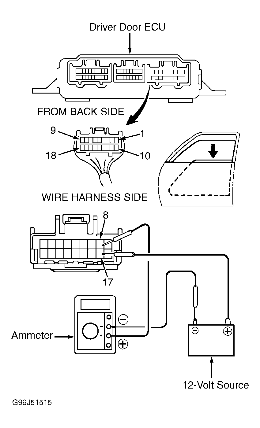 1. Disconnect driver door ECU harness connector D-24. Using an ammeter, connect positive lead to terminal No. 9 (Blue/Orange wire) of harness connector D-24 and negative lead to negative terminal of battery. See Fig 1. Using a jumper wire, connect positive battery voltage to terminal No. 18 (Orange wire) at harness connector D-24.