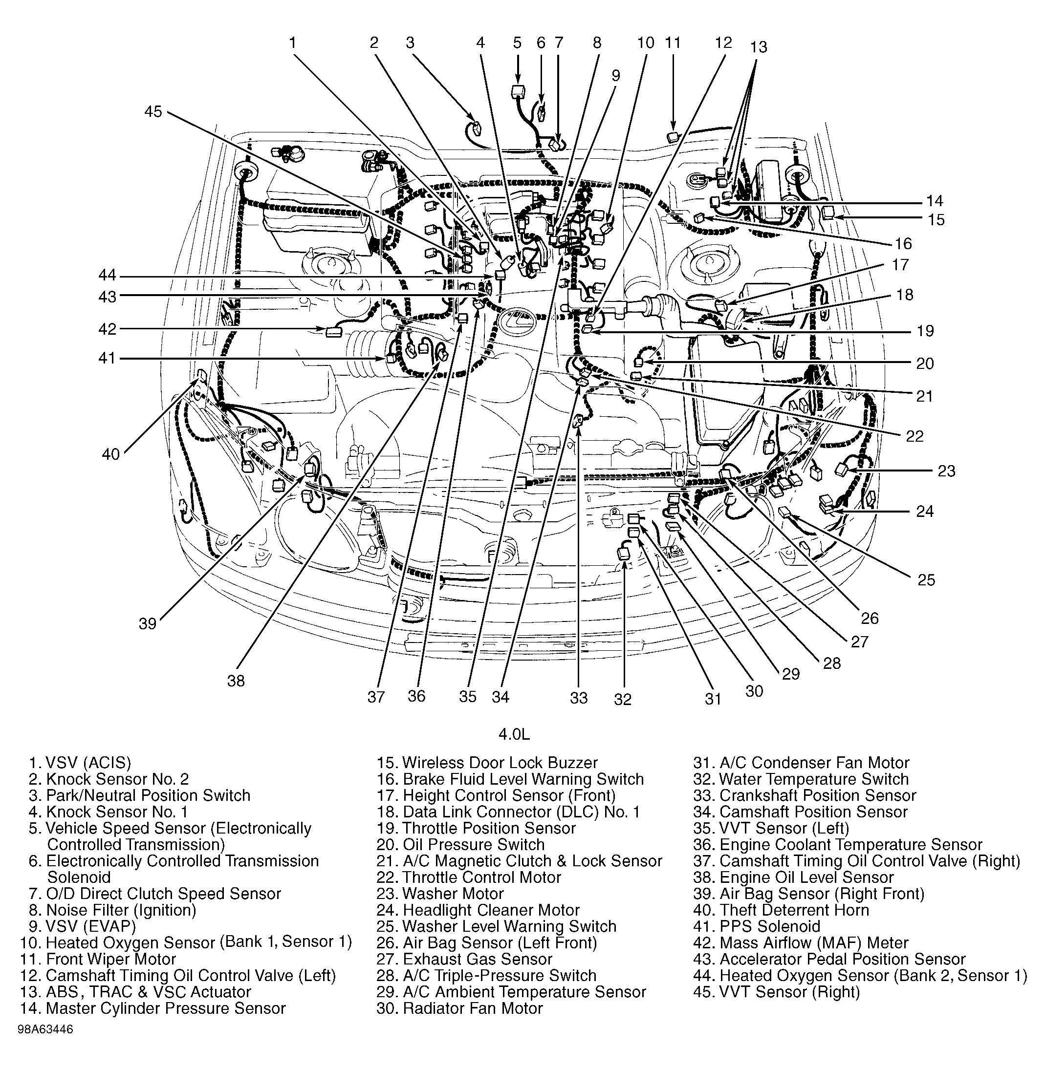 | Water Temperature Switch (4.0L) | At front of engine compartment, behind left side of grille. See Figure. |