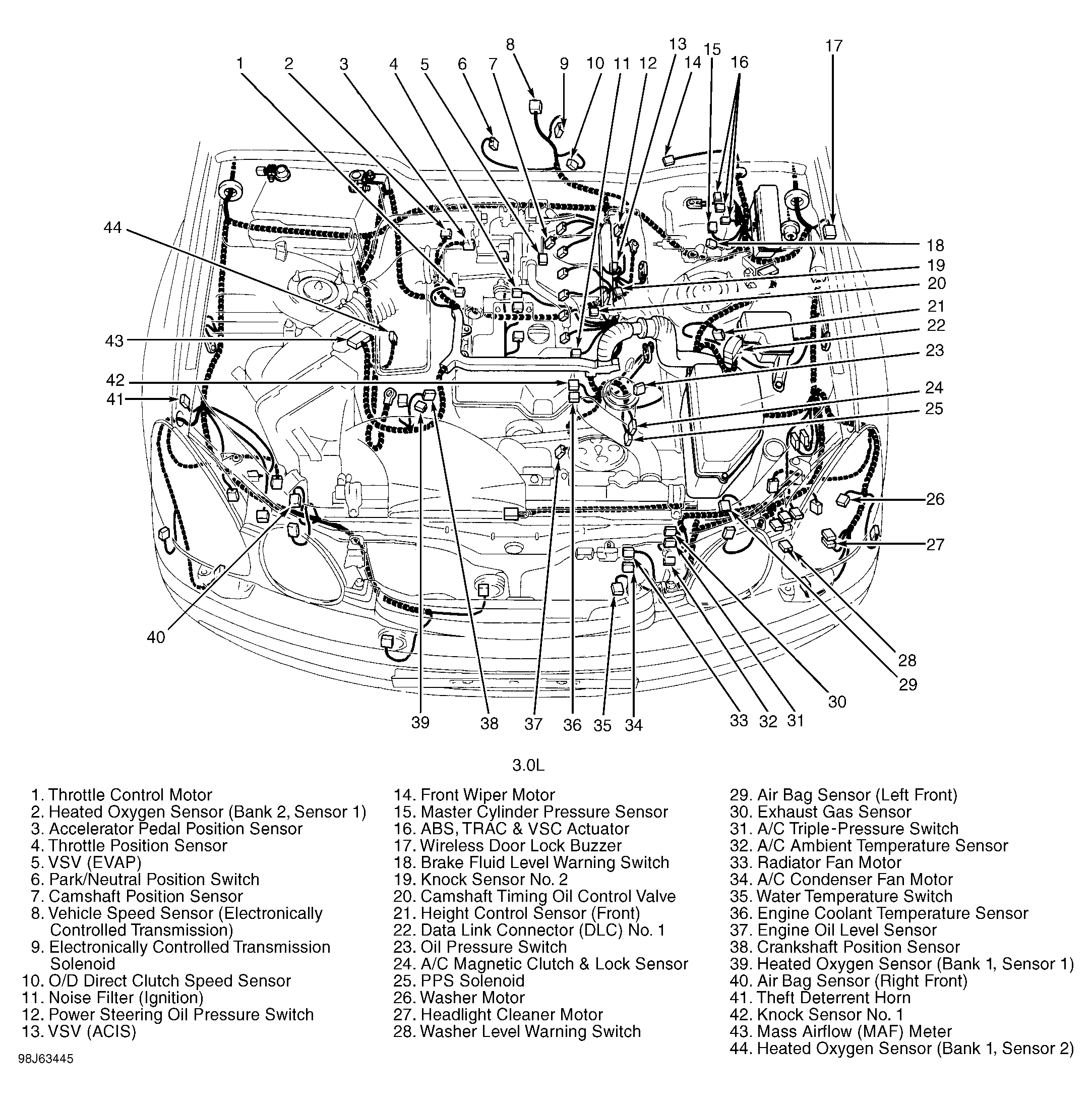 | Water Temperature Switch (3.0L) | At front of engine compartment, behind left side of grille. See Figure. |