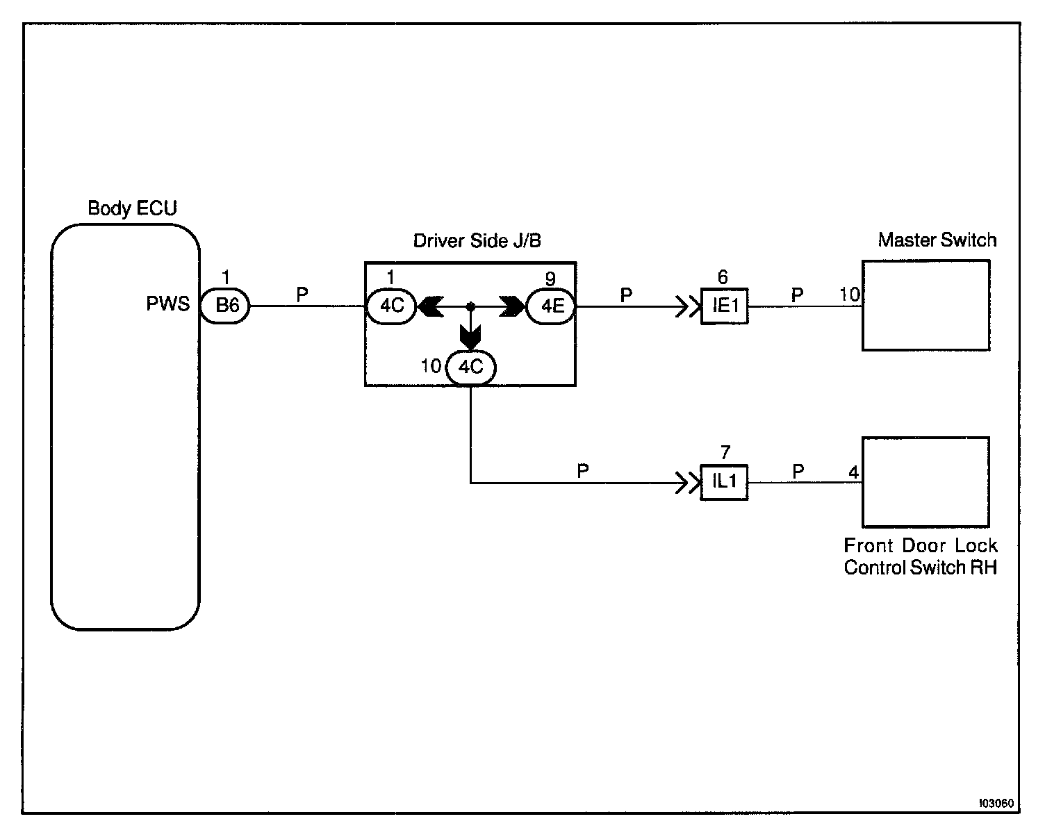 This circuit is the power source of the master switch for the driver's door and the door lock switch for the passenger's doors.