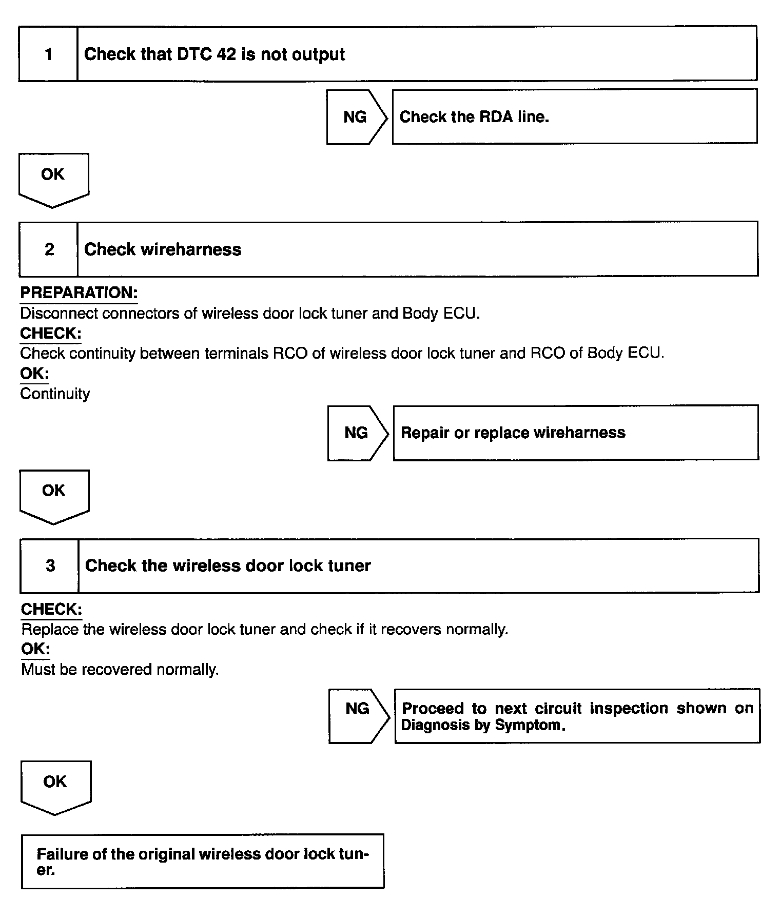 The signal from the transmitter will be input to the body ECU through RDA line. RDA line is diagnosed by the Body ECU, so check DTC also in case of the failure of the wireless function.