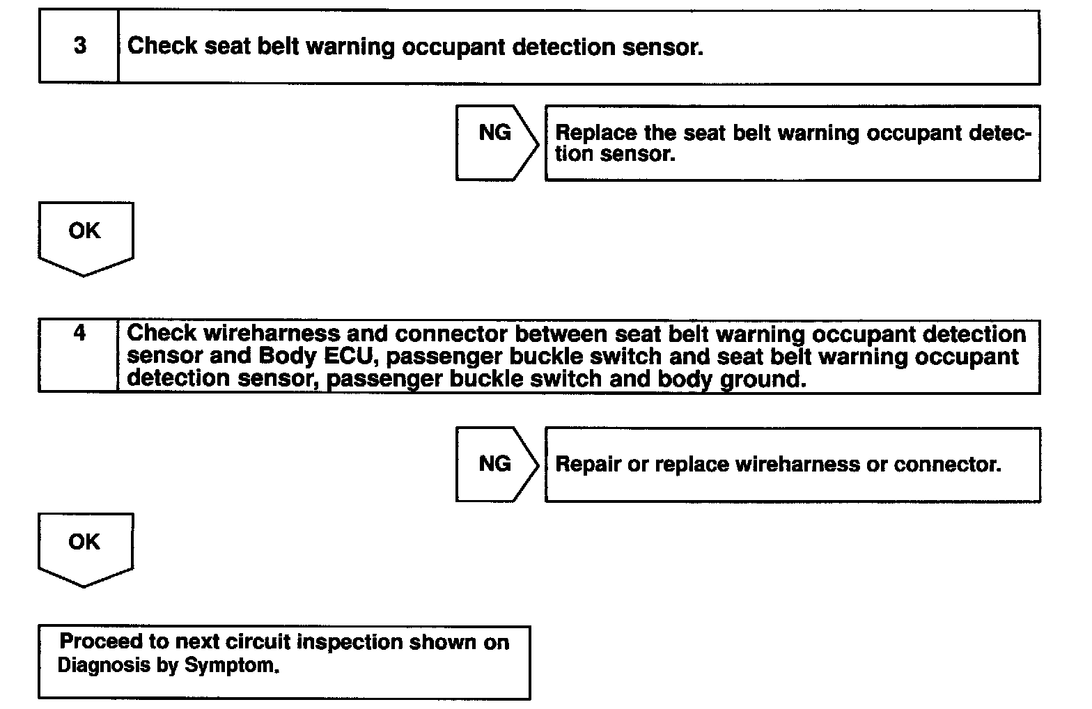 CIRCUIT DESCRIPTIONThis circuit detects the conditions of the passenger buckle switch and the seat belt warning occupant detection sensor, and makes the passenger seat belt warning flash.