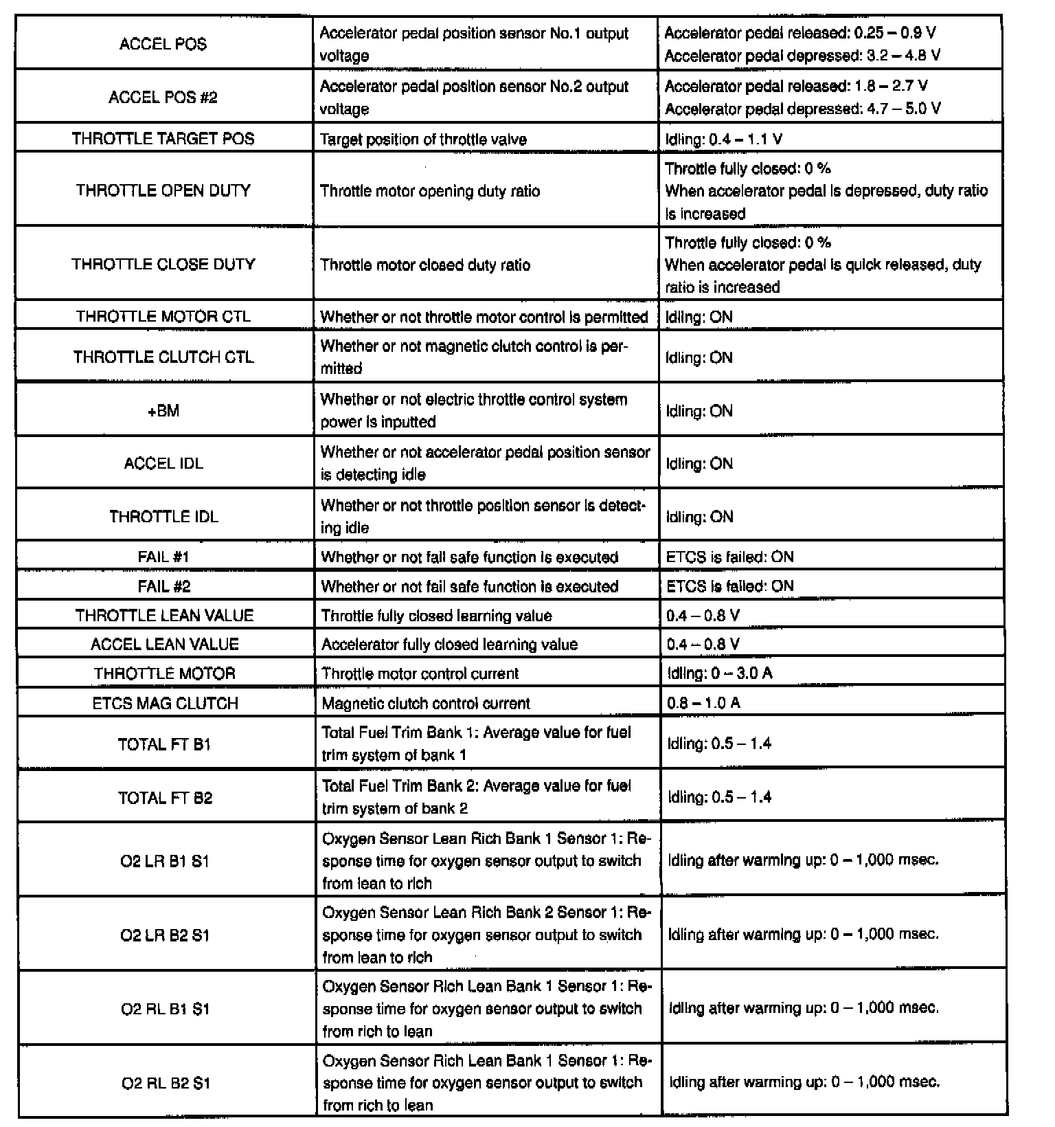 NOTE: The values given for "Normal Condition" are representative values, so a vehicle may still be normal even if its value varies from those listed here. So do not decide whether a part is faulty or not solely according to the "Normal Condition" here.a. CARB mandated signals.