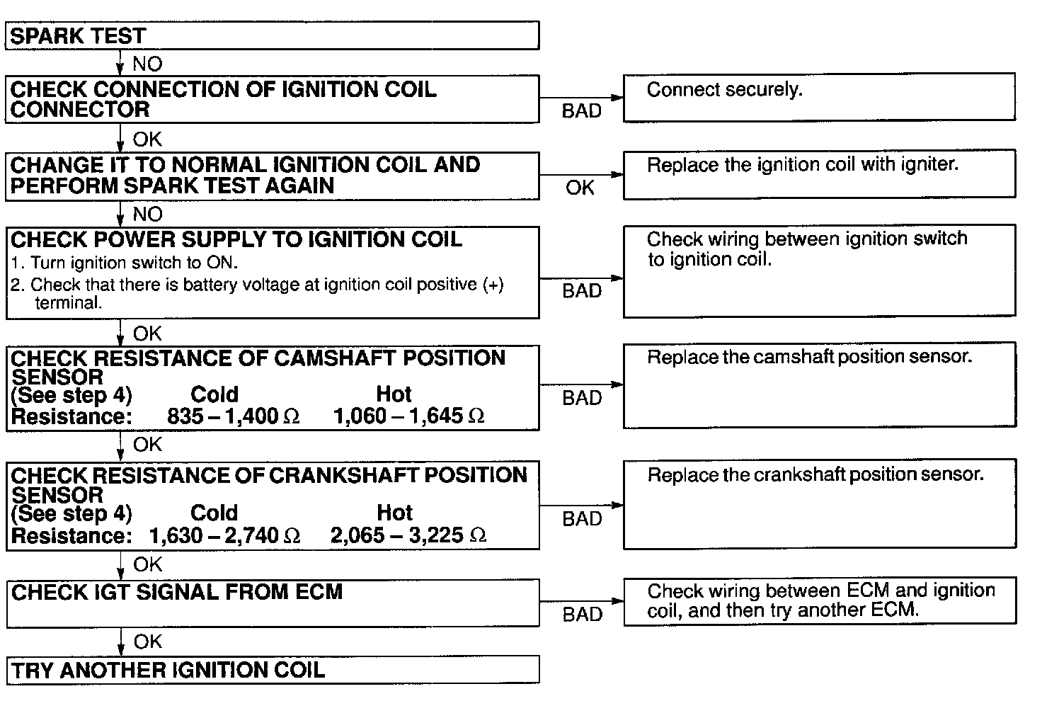 NOTE: To prevent gasoline from being injected from injectors during this test, crank the engine for no more than 5 - 10 seconds at time. If the spark done not occur, do the test as follows: