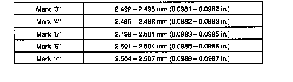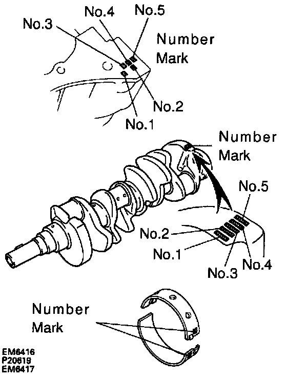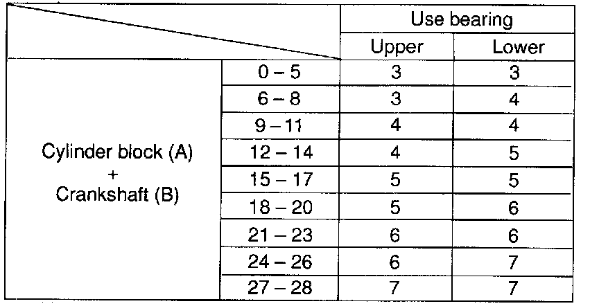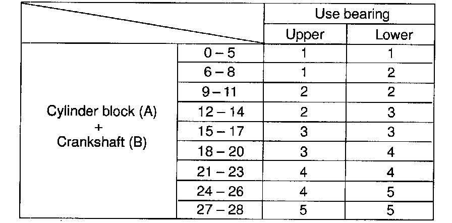HINT: If using a standard bearing, replace it with one having the same number. If the number of the bearing cannot be determined, select the correct bearing by adding together the numbers imprinted on the cylinder block and crankshaft, then refer to the table below for the appropriate bearing number. There are 5 sizes of the standard bearings. For No.1 and No.5 position bearings, use bearings marked "3", "4", "5", "6" and "7". For others position bearings, use bearings marked "1", "2", "3", "4" and "5".