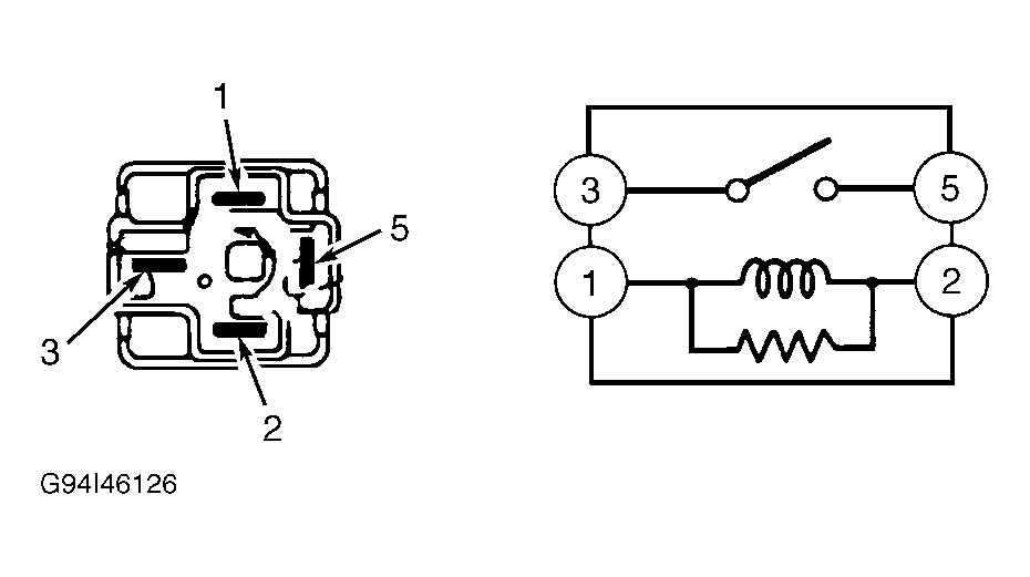 Remove starter relay. See COMPONENT LOCATIONS . Check for continuity between starter relay terminals No. 1 and 2. See Fig 1. Continuity should exist. If continuity does not exist, replace relay. Check for continuity between starter relay terminals No. 3 and 5. Continuity should not exist. If continuity exists, replace relay. Apply battery voltage across starter relay terminals No. 1 and 2. Check for continuity between starter relay terminals No. 3 and 5. Continuity should exist. If continuity does not exist, replace relay.