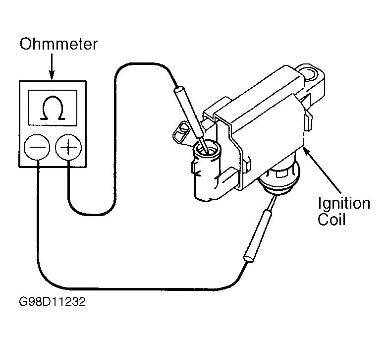 Using ohmmeter, check ignition coil secondary resistance between electrical terminal and spark plug terminal on ignition coil. See Fig 2. Replace ignition coil if ignition coil secondary resistance is not within specification. See IGNITION COIL RESISTANCE (OHMS) table. Reinstall ignition coil.IGNITION COIL RESISTANCE (OHMS)