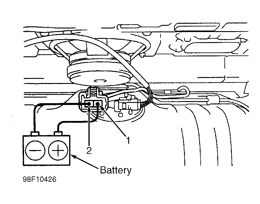 6. Locate fuel pump resistor in left front corner of engine compartment (left of battery). Disconnect fuel pump resistor Black 2-pin connector. Measure resistance between resistor terminals. If resistance is not .70-.76 ohm at 68°F (20°C), replace resistor. If resistance is .70-.76 ohm, check for open circuit between fuel pump relay and fuel pump resistor, or fuel pump resistor and fuel pump. Repair as necessary.