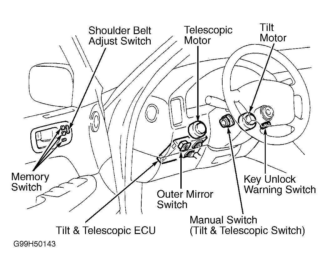The power tilt steering column system consists of a key unlock warning switch, a manual switch, telescopic motor with position sensor, tilt motor with position sensor and a tilt and telescopic ECU. See Fig 1.