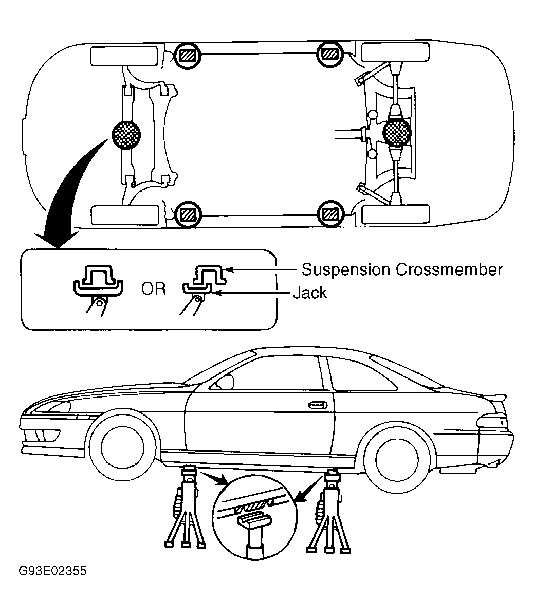 Place manufacturer-supplied jack under reinforced support points of sill, between front and rear wheels. Safety stands may also be placed at these points. See Figure-Figure .