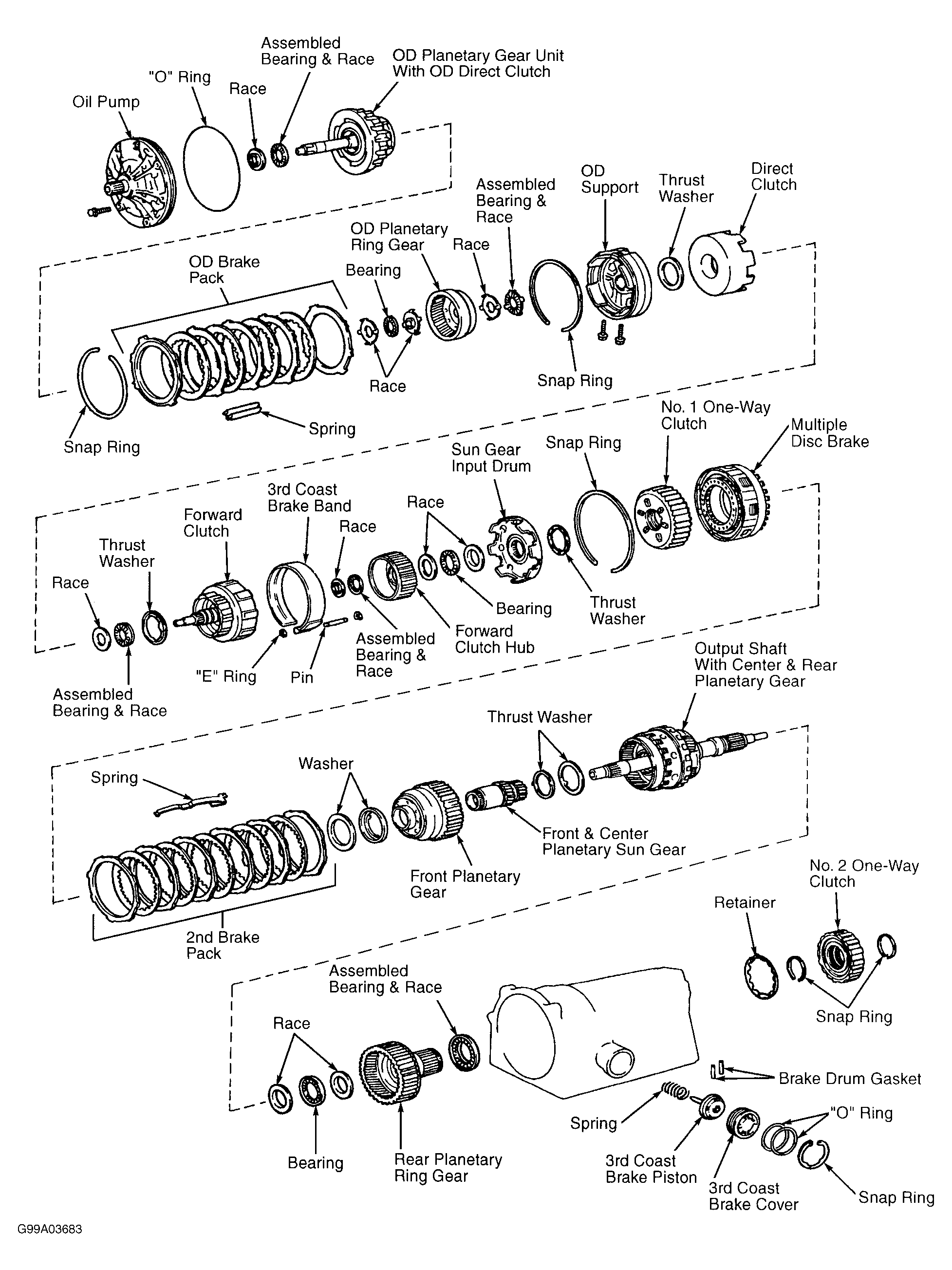- Install rear planetary ring gear with thrust bearing. Install snap ring securing rear planetary ring gear. Install races and bearing onto rear planetary ring gear. Install output shaft with center and rear planetary gear into case. Install thrust washer. See Figure.