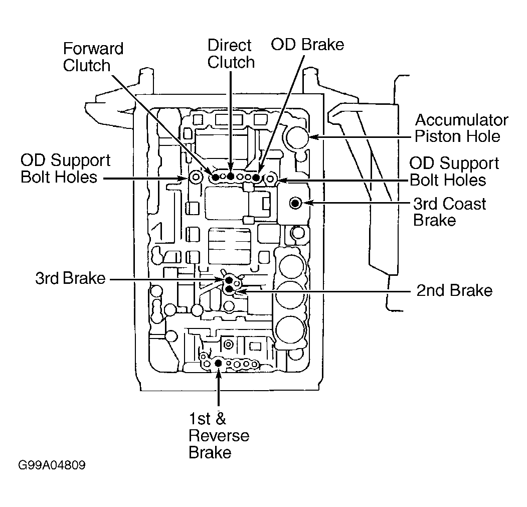 - Install oil pump bolts and tighten to specification. See TORQUE SPECIFICATIONS . Ensure input shaft rotates smoothly. Apply air pressure to specified oil passages to check operating components. See Figure. When air checking OD direct clutch, O/D accumulator piston hole must be plugged.