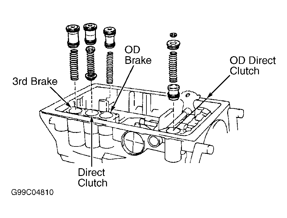 Component, (Code) & Color Free Length - In. (mm) Diameter - In. (mm) Direct Clutch (C2) V8 Inner 1.409 (35.80) .551 (14.00) Outer 3.520 (89.41) .776 (19.70) 6-Cyl. Inner White 1.409 (35.80) .551 (14.00) Outer White 3.223 (81.86) .776 (19.70) OD Brake (B0) White 2.732 (69.40) .640 (16.25) OD Direct Clutch (C0) 2.559 (65.00) .811 (20.59) 3rd Brake (B2) Pink/White 3.185 (80.91) .786 (19.97) Courtesy of © TOYOTA, LICENSE AGREEMENT TMS1002