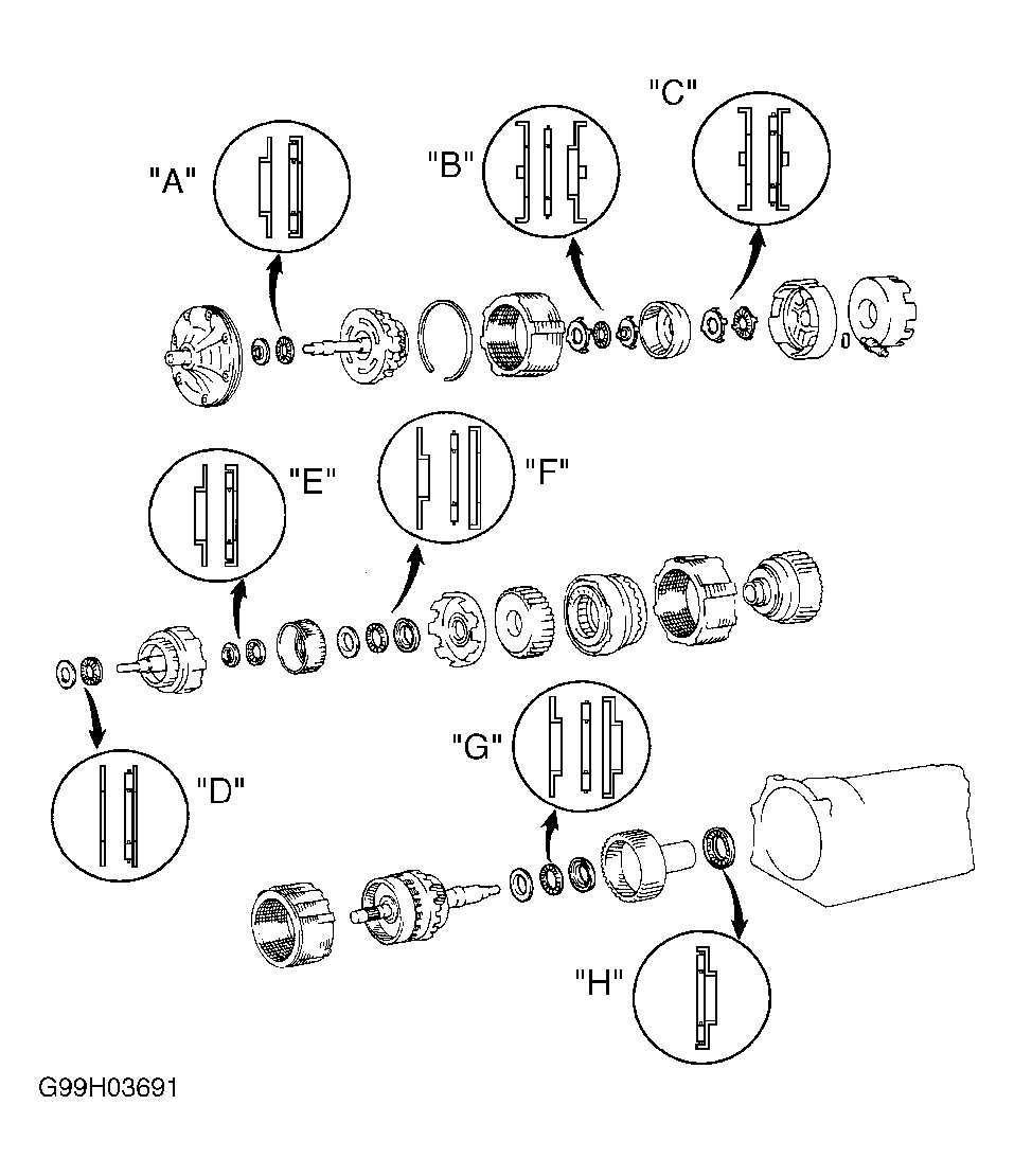 Coat all oil seal rings, clutch discs, clutch plates, rotating parts, and sliding surfaces with ATF prior to reassembly. All gaskets and rubber "O" rings should be replaced. Ensure ends of snap rings are not aligned with cutouts and are installed correctly in groove. If a worn bushing is to be replaced, replacement must be made with subassembly containing that bushing. Check thrust bearings and races for wear or damage. Use petroleum jelly to hold parts in place. Replace parts as necessary. Clutch discs should be soaked in ATF for 15 minutes before installation.