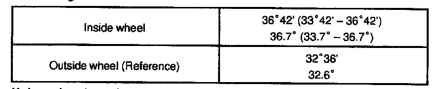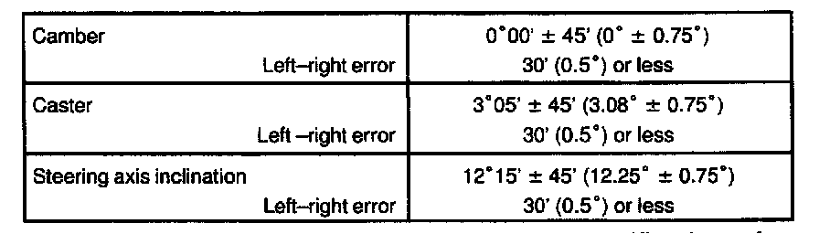 If the steering axis inclination is not within the specification, after the camber and caster have been correctly adjusted, recheck the steering knuckle front wheel for bearing or looseness.