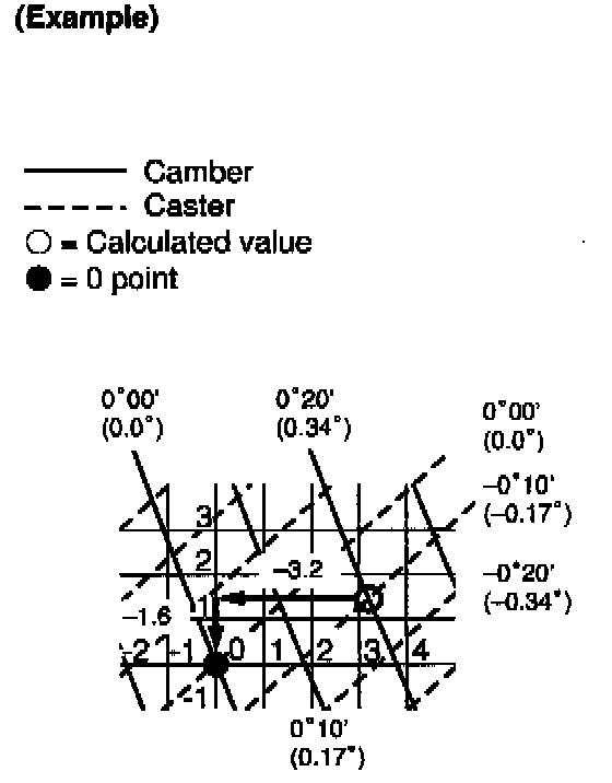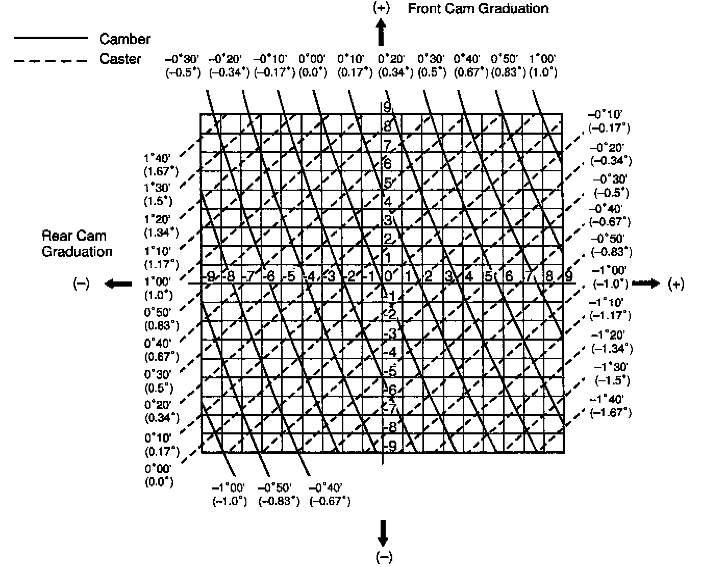 3. As shown in the chart, read the distance from the marked point to 0 point, and adjust the front and/or rear adjusting cams accordingly.