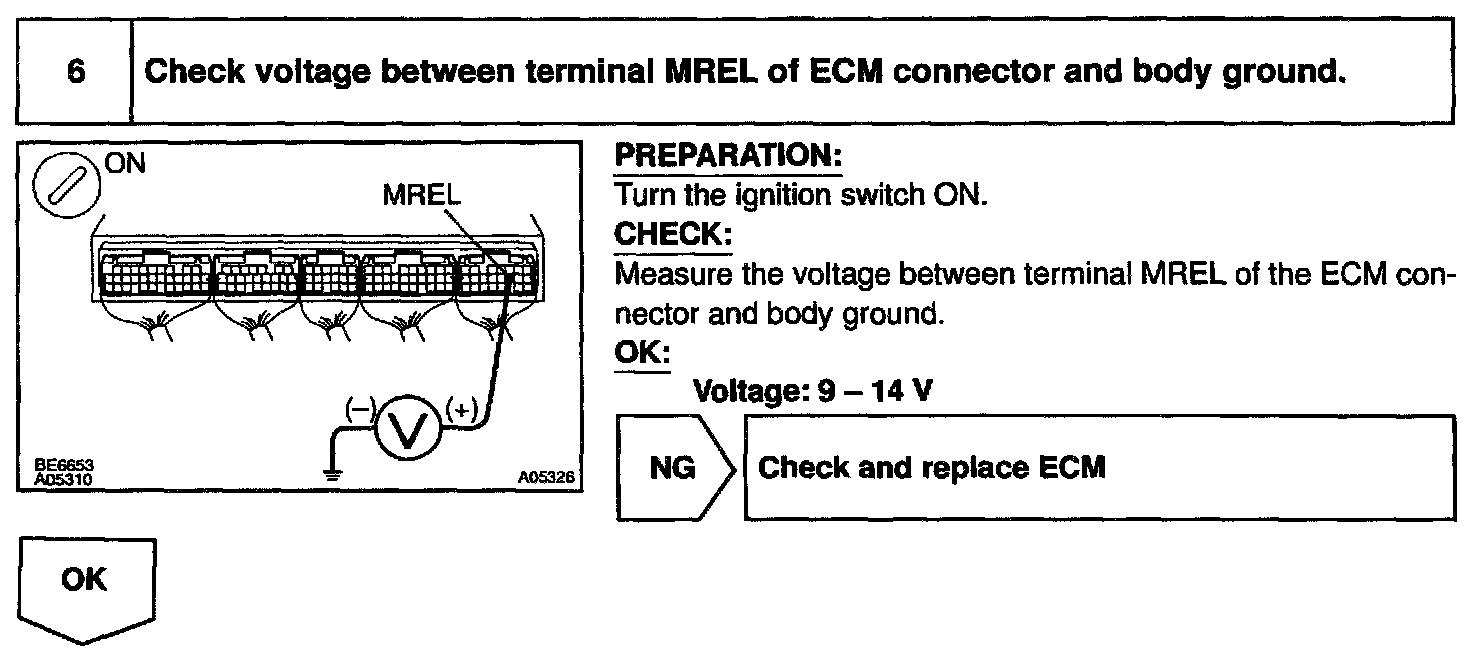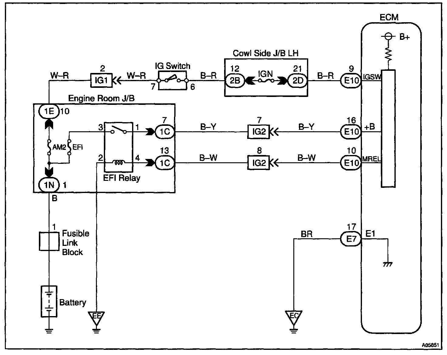This signal causes current to flow to the coil, closing the contacts of the EFI main relay and supplying power to terminal +B of the ECM.