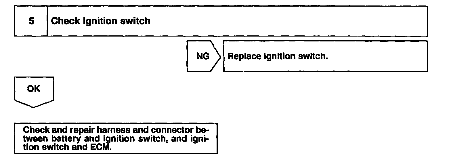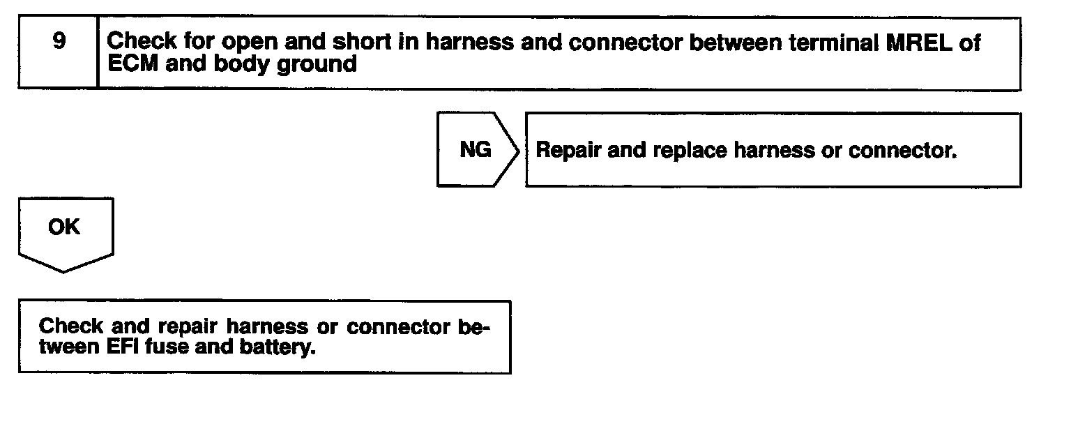 When the ignition switch is turned ON, battery positive voltage is applied to terminal IGSW of the ECM and the EFI main relay (Marking: EFI) control circuit in the ECM sends a signal to terminal MREL of the ECM switching on the EFI main relay.