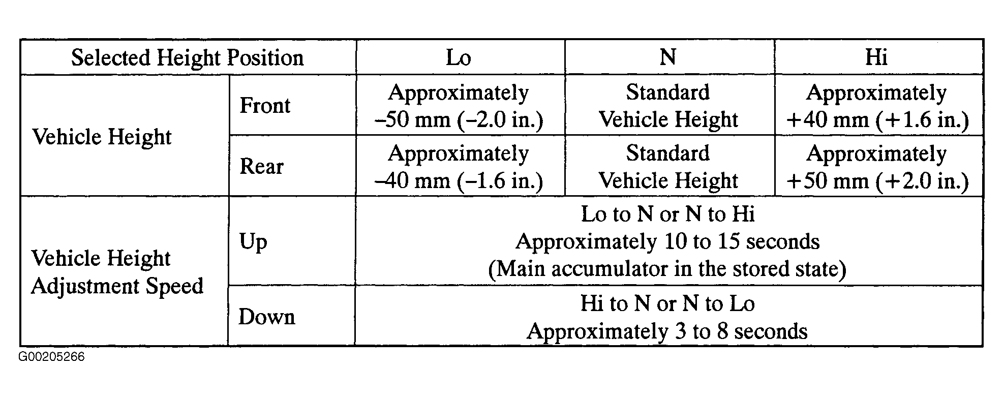 There are three types of vehicle heights which can be selected by operating switch: normal vehicle height (N), low vehicle height (Lo) and high vehicle height (Hi). See Fig 1.