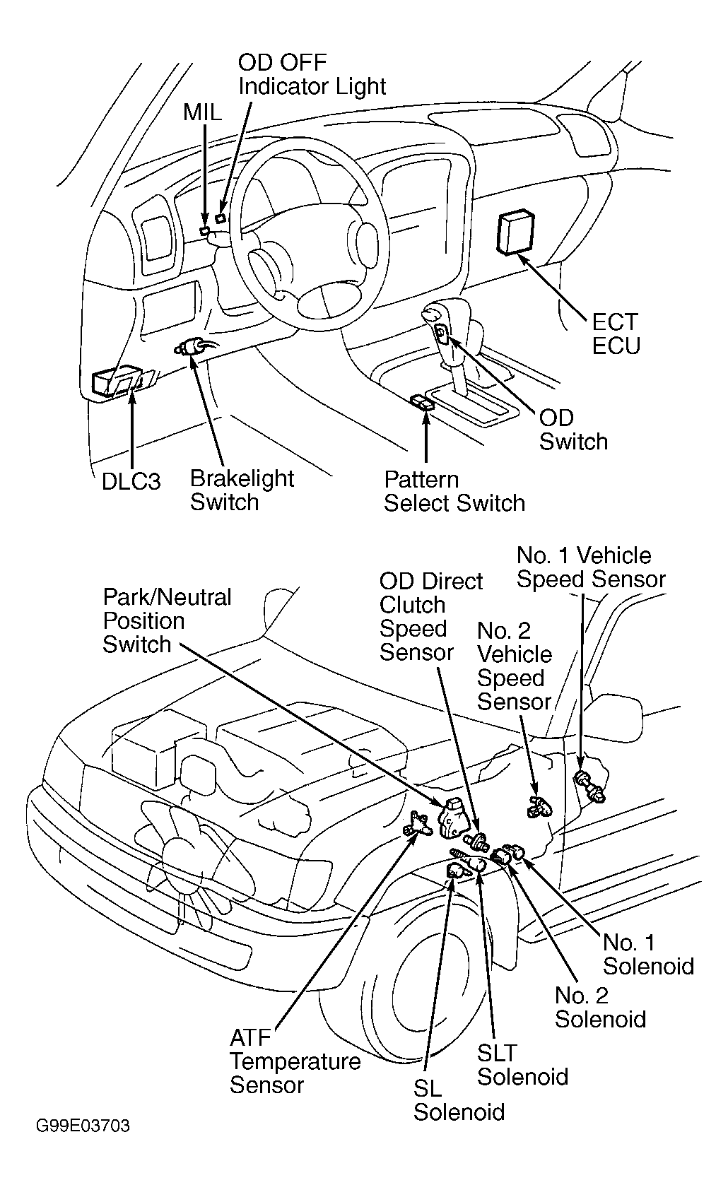 ECM receives information from various input devices and uses this information to control No. 1 and No. 2 solenoids on transmission valve body for transmission shifting, SL solenoid for torque converter clutch lock-up and SLT solenoid to provide smooth transmission shifting. ECM contains a self-diagnostic system, which will store a DTC if a failure or problem exists in the electronic control system. DTC can be retrieved to determine problem area. See DIAGNOSIS & TESTING . Note location of ECM. See Figure.