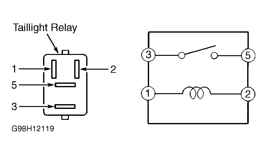 - Note terminal identification on taillight relay. See Fig 1. Using an ohmmeter, check continuity between terminals No. 1 and 2. Apply battery voltage to terminal No. 2 and ground to terminal No. 1. Continuity should now exist between terminals No. 3 and 5. Replace taillight control relay if defective.