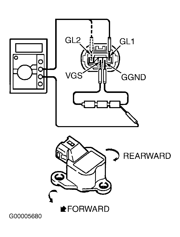 3. Using voltmeter, check voltage between sensor terminals GGND and GL2. With sensor in horizontal position, voltage reading should be about 2.3 volts. Lean sensor forward. Voltage reading should be about 2.3-4.1 volts. Lean sensor rearward. Voltage reading should be about 0.4-2.3 volts. Replace deceleration sensor as necessary.