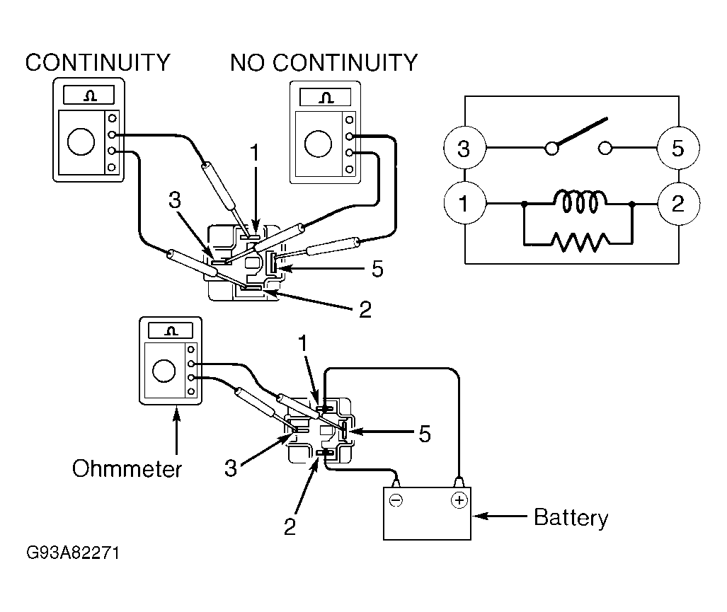 - Check relay operation by applying battery voltage through terminals No. 1 and 2. See Fig 2. Continuity should now exist between terminals No. 3 and 5. If relay does not test as indicated, replace relay.