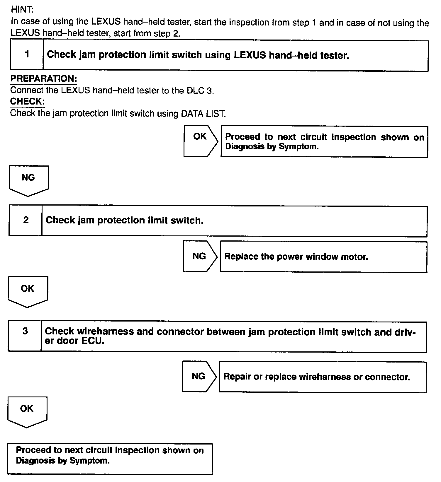 Home >> Lexus >> 2000 >> RX 300 AWD V6-3.0L (1MZ-FE) >> Repair and Diagnosis >> Body and Frame >> Body Control Systems >> Testing and Inspection >> Component Tests and General Diagnostics >> Driver Door Control System >> Jam Protection Limit Switch Circuit