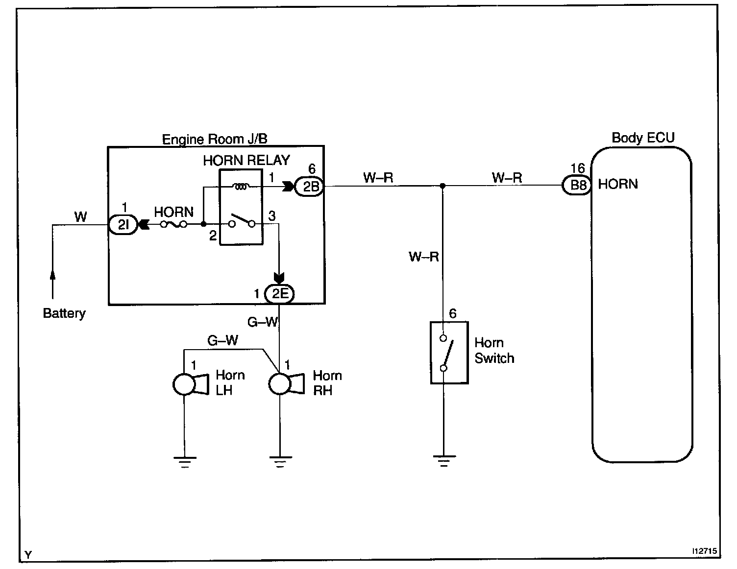 The horn is connected to the Body ECU and activated by the Body ECU during warning of the theft deterrent system.