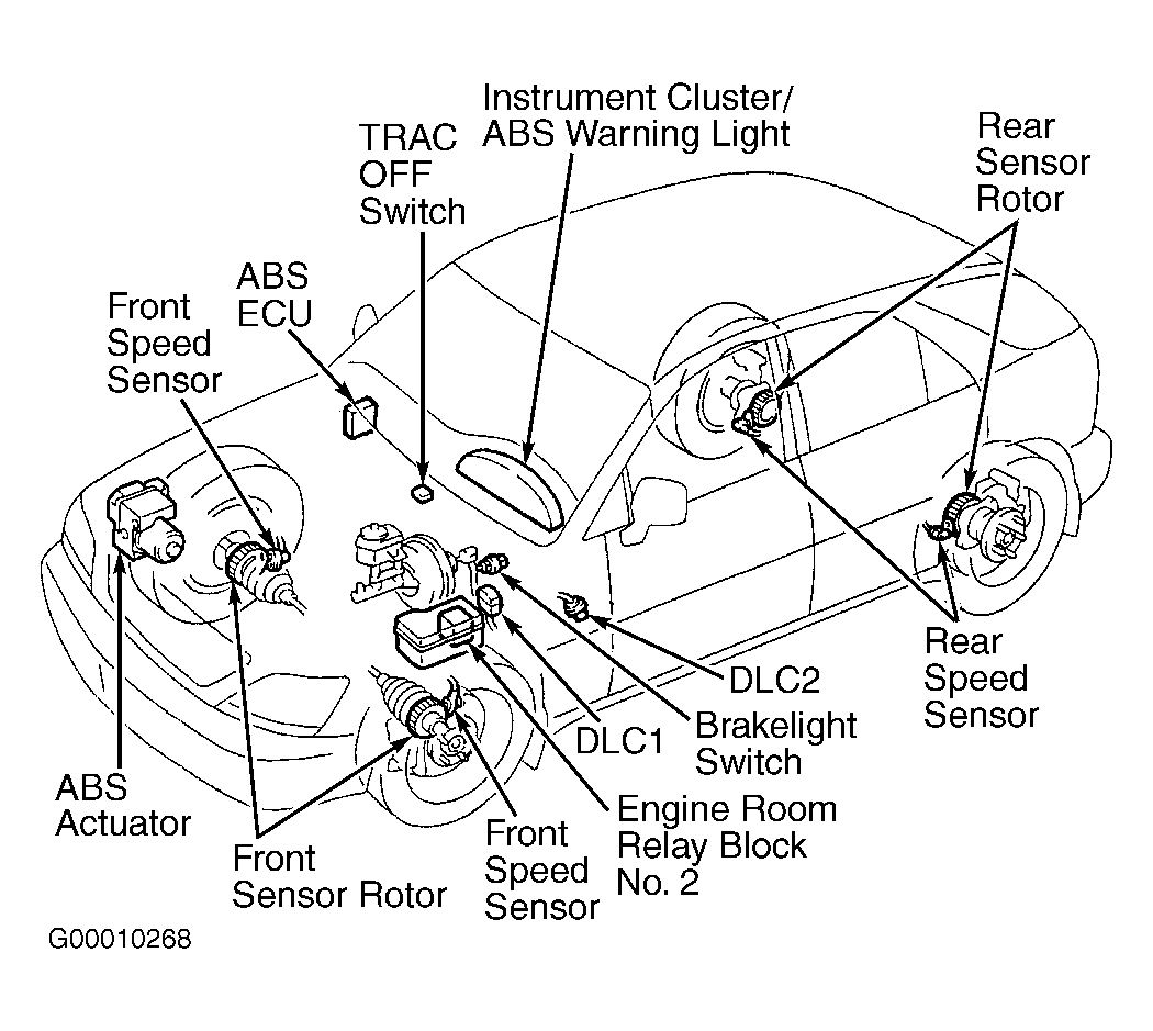 Anti-Lock Brake System (ABS) controls fluid pressures to each individual front brake caliper and rear brake calipers during a panic stop to prevent wheel lock-up. System consists of actuator, solenoid relay, pump motor relay, Electronic Control Unit (ECU), and a speed sensor at each wheel. See Fig 1. If a system fault occurs, the ECU stores a self-diagnostic code(s) that can be retrieved to diagnose malfunction.