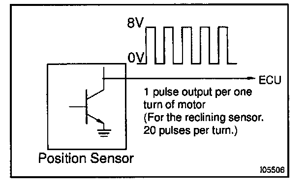 The position sensor senses movement of the seat and send pulse signals to the ECU. The position sensor sends pulses to the ECU in proportion to the amount of seat movement, as shown in the diagram.