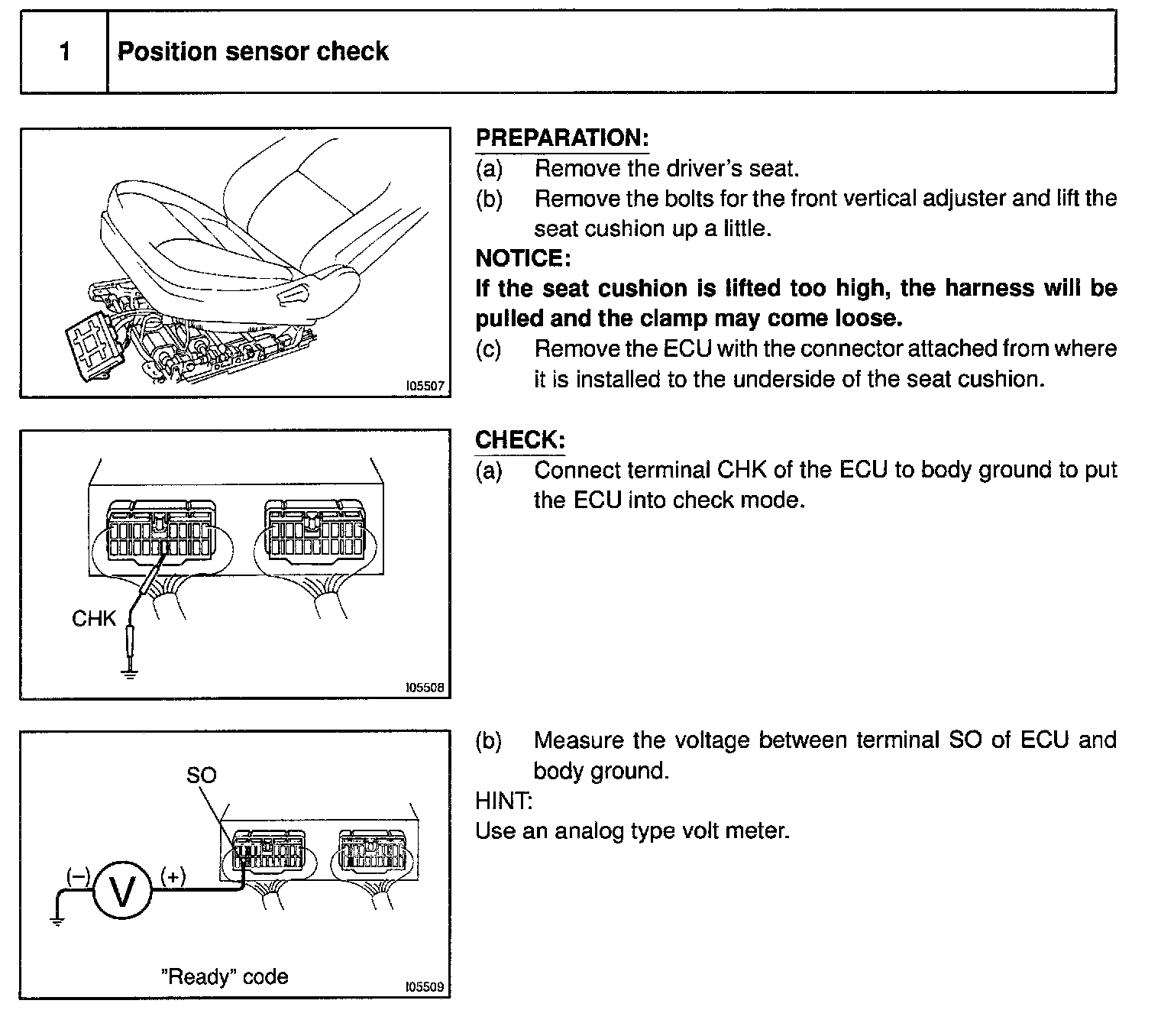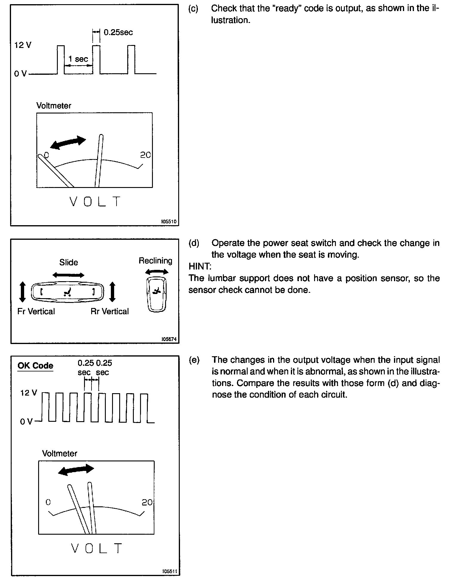 Home >> Lexus >> 2000 >> SC 300 L6-3.0L (2JZ-GE) >> Repair and Diagnosis >> Body and Frame >> Seats >> Memory Positioning Systems >> Testing and Inspection >> Power Seat Control System >> Component Tests and General Diagnostics >> Position Sensor Circuit