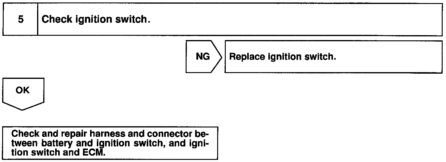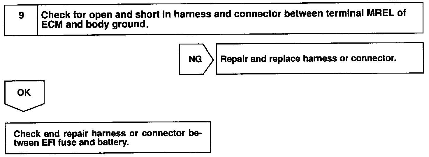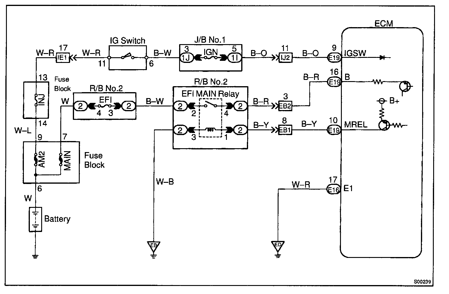 When the ignition switch is turned ON, battery positive voltage is applied to terminal IGSW of the ECM and the EFI main relay control circuit in the ECM sends a signal to terminal MREL of the ECM switching on the EFI main relay.