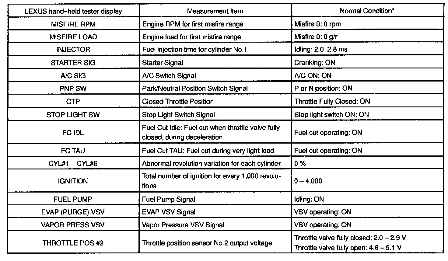 NOTE: The values given for "Normal Condition" are representative values, so a vehicle may still be normal even if its value varies differ from those listed here. So do not decide whether a part is faulty or not solely according to the "Normal Condition" here.