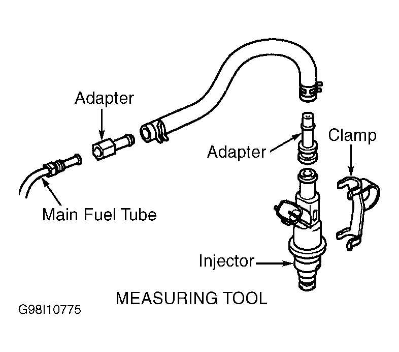 1. Remove fuel injector. See FUEL SYSTEM under REMOVAL, OVERHAUL & INSTALLATION article. Disconnect fuel inlet hose from main fuel tube. Install Fuel Tube Adapter (09268-52011) to fuel main tube. Connect fuel hose from Injection Measuring Tool Set (09268-41047) to fuel tube adapter. See Fig 1.