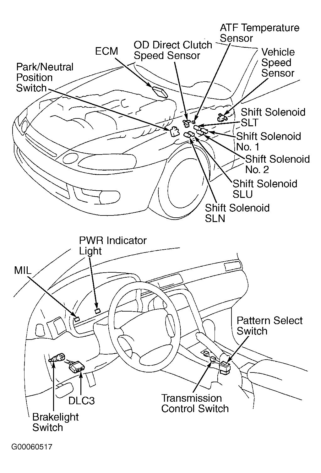 ECM receives information from various input devices and uses this information to control No. 1 and No. 2 solenoids on transmission valve body for transmission shifting and lock-up solenoid (also called SL or SLU solenoid) for torque converter lock-up. ECM also controls SLN and SLT solenoid operation. ECM contains a self-diagnostic system, which will store a Diagnostic Trouble Code (DTC) if a failure or problem exists in electronic control system. Trouble code can be retrieved to determine problem area. See DIAGNOSIS & TESTING . Note location of ECM. See Figure-Figure .