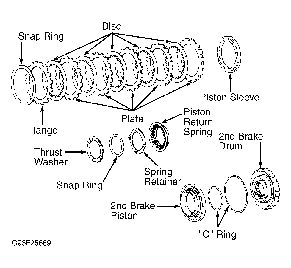 Coat NEW "O" rings with ATF and install. Carefully press 2nd brake piston into 2nd brake drum. Install piston return spring and spring retainer. See Fig 1. Compress return spring and install snap ring. Apply compressed air to 2nd brake drum. Ensure 2nd brake piston moves smoothly. Install thrust washer. Ensure cut-out portions of thrust washer match teeth of spring retainer.