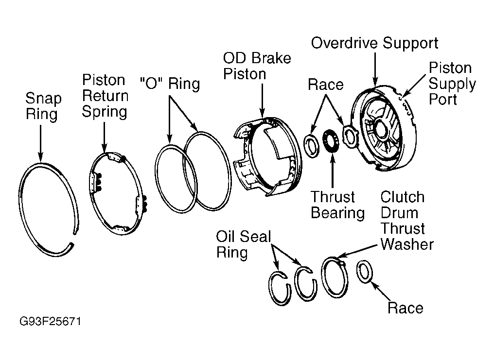 Remove all thrust washers from overdrive support. Using appropriate compressor, compress piston return spring and remove snap ring. Place support on direct clutch assembly. Hold brake piston in a level position. Carefully apply air pressure to piston supply port and remove piston. Remove oil seal rings from rear of support. See Figure.