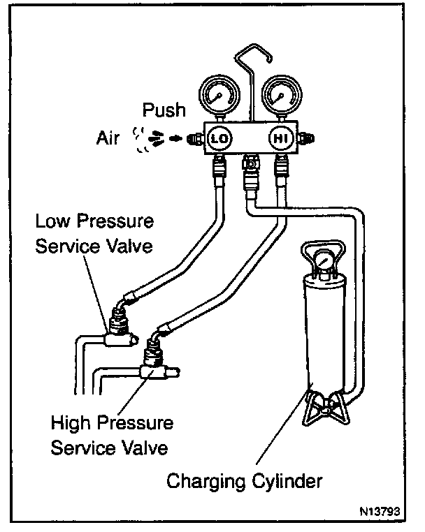 - Never run the engine when charging the system through the high pressure side.