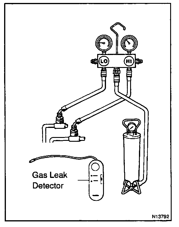 c. Using a gas leak detector, check the system for leakage.