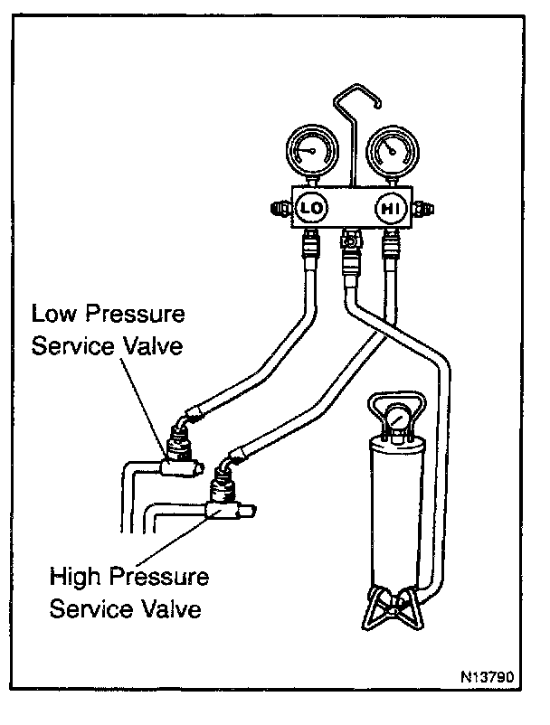 CAUTION: Do not open both high and low hand valves of manifold gauge set.