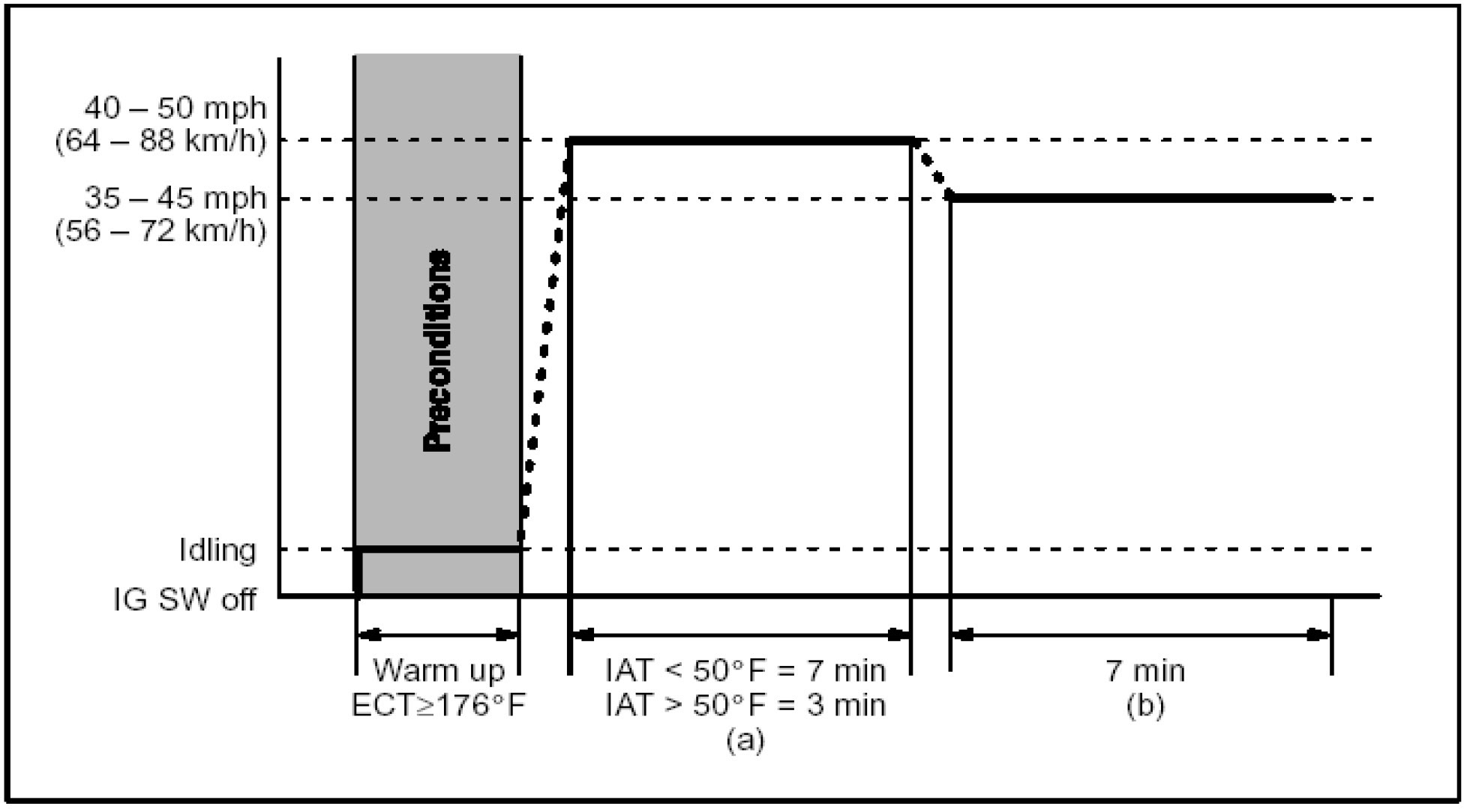 a) Drive the vehicle at 40 - 55 mph (64 - 88 km/h) for the time described below: